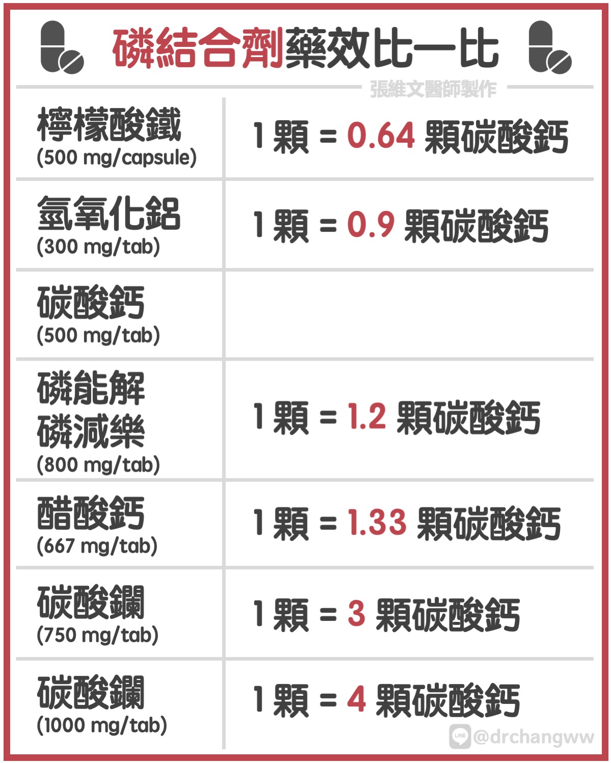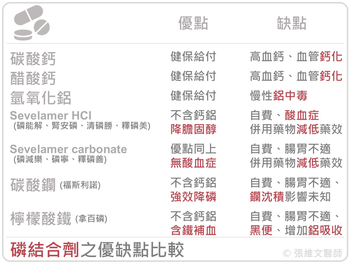 在此將這些藥物列表比較如下,希望有助大家更了解藥物的優缺點,在和您的腎臟科醫師討論後,選出最適合自己服用的磷結合劑。